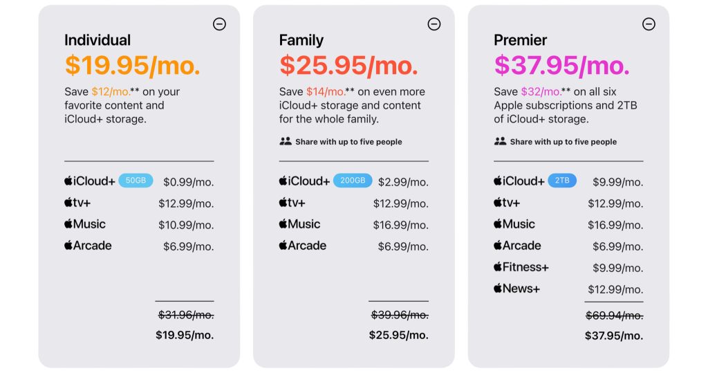 Premier Music / TV+ / Arcade / News+ / Fitness+ / iCloud+ 2TB $37.95 $69.94 $32.00